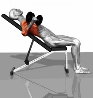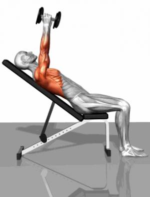 | 預(yù)備姿勢(shì): 1、仰臥于上斜訓(xùn)練凳上,頭部枕骨、兩肩胛骨、胸椎、骶尾骨緊貼凳面,腰部留有一掌厚度的空隙。 2、臀部坐在凳面上,雙腿分開(kāi),屈膝90度,雙腳踏托桿。 3、雙手分開(kāi)一個(gè)半肩寬,肘關(guān)節(jié)微屈,于胸部正上方持啞鈴。 4、目視前上方,調(diào)整呼吸,準(zhǔn)備。 |